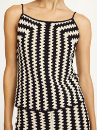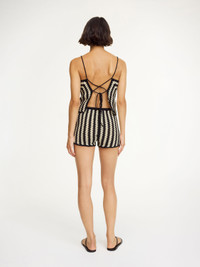 Combining bohemian and graphic design notes, the crocheted Doria top is sure to turn heads. The organic cotton design has an open back, where its adjustable straps are artistically tied, and a straight neckline. For a set with a point of difference, pair with the Dor shorts. - Slim fit - Model is 175 cm and is wearing a size S - Open back - Adjustable straps - Straight neckline - Crocheted design DETAILS COLOUR Crochet Black & White COMPOSITION 100% cotton organic CARE Delicate machine wash at 30°c PRODUCT CODE Style #103072QJ8