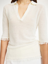 Bohemian overtones and a minimalist ease define the Dreelo top. It’s detailed with a V-neck, relaxed collar and lush fringes. Made in a mix of linen and silk, the short-sleeved design is ideal as the temperatures rise. - Slim fit - Model is 178 cm and is wearing a size S - V-neck - Sharp collar - Cropped sleeves - Fringe details DETAILS COLOUR Soft White COMPOSITION 61% linen, 15% silk, 12% cotton, 12% polyamide CARE Hand wash PRODUCT CODE Style #10304503Z