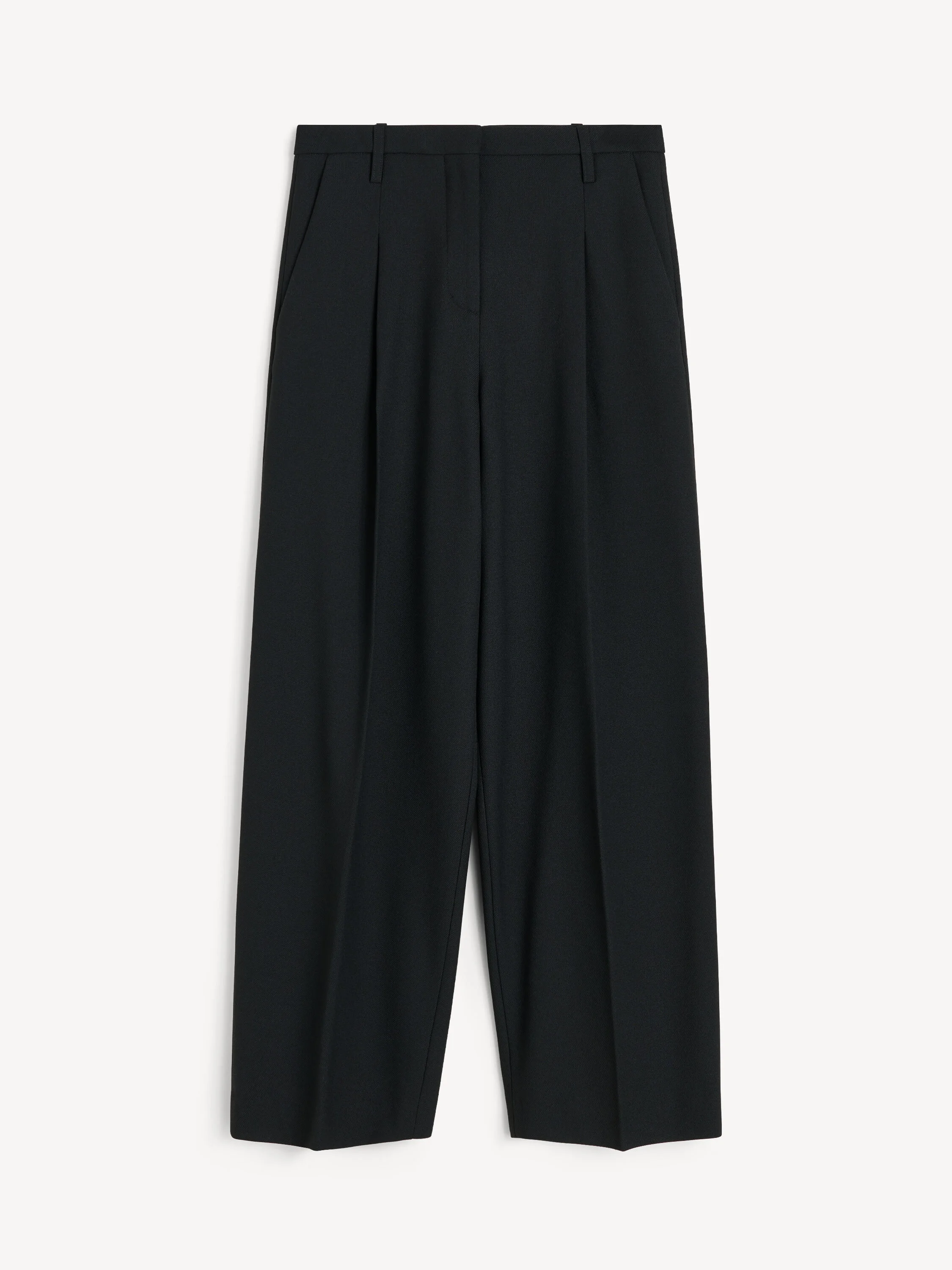 Made for the office hours – and beyond – the wide-leg Elsa trousers are both timeless and effortless. Inspired by the tailored classic, they’re completed with a zip, button and hook closure, belt loops, side- and back pockets, and creases both front and back. - Loose fit - Model is 178 cm and is wearing a size 36 - High waisted - Zip, button and hook closure - Belt loops - Side pockets - Back pockets - Front and back crease DETAILS COLOUR Black COMPOSITION 69% polyester, 29% viscose, 2% elastane CARE No Wash PRODUCT CODE Style #103456050