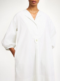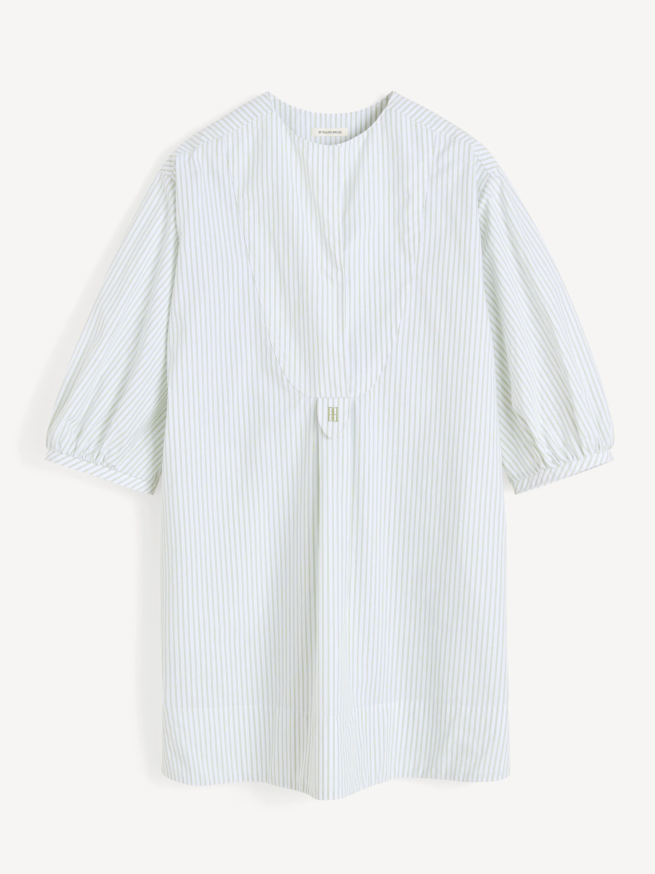 For a timeless wardrobe that will transpire seasons, add the Faya dress in organic cotton. Worn easily on its own or with wide-leg trousers, the tunic silhouette is completed with a bib-front, hidden buttons and side pockets. A detail worth noticing? The embroidered monogram on its front. - Loose fit - Model is 179 cm and is wearing a size 36 - Bib-front - Hidden button closure - Tunic silhouette - Embroidered monogram - Side pockets DETAILS COLOUR Twin Stripe COMPOSITION 100% cotton organic CARE Wash at 30°c PRODUCT CODE Style #103559QG5