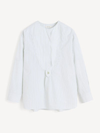 For a timeless wardrobe that will transpire seasons, add the Fayette shirt in organic cotton. Paired neatly with wide-leg trousers, the tunic silhouette is completed with a bib-front, hidden buttons and side seam slits. The best detail? The embroidered monogram on its front. - Oversized fit - Model is 177 cm and is wearing a size 36 - Bib-front - Hidden buttons - Tunic silhouette - Side slits - Embroidered monogram DETAILS COLOUR Twin Stripe COMPOSITION 100% cotton organic CARE Wash at 30°c PRODUCT CODE Style #103138QG5