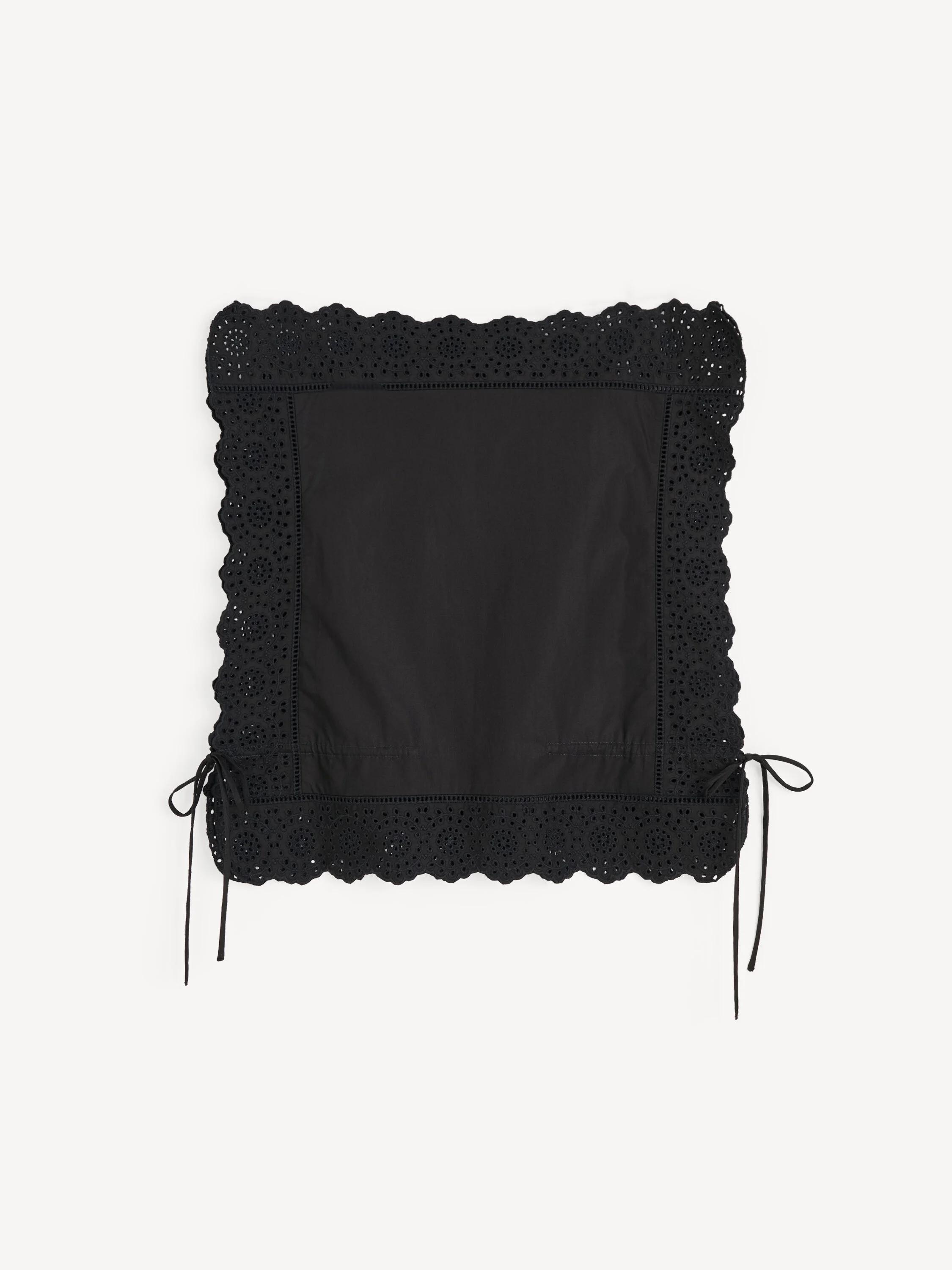 Crisp and lightweight, the Gerda top features delicate broderie anglaise trims – adding a subtle touch of femininity. Made from organic cotton, the square silhouette is complete with adjustable waist ties. Wear with the matching Greta shorts or Gretana trousers. - Loose fit - Model is 177 cm and is wearing a size 36 - Square silhouette - Broderie Anglaise detailing - Adjustable waist ties - Dropped arm opening - Unlined DETAILS COLOUR Black COMPOSITION 100% cotton organic CARE Wash at 30°c PRODUCT CODE Style #103911050