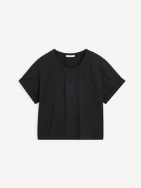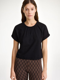 Classic T-shirts that don’t compromise on comfort or versatility are essential in any year-round wardrobe – the Hedalia design offers both. Crafted in organic cotton to a slightly cropped silhouette and with folded sleeves, you will choose this T-shirt on repeat. - Regular fit - Model is 173 cm and is wearing a size S - Slightly cropped silhouette - Embroidered monogram - Folded T-shirt sleeves DETAILS COLOUR Black COMPOSITION 100% cotton organic CARE Delicate machine wash at 30°c PRODUCT CODE Style #102295050