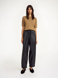 Relaxed charm defines the By Malene Birger Joanni trousers. Constructed from soft and supple lamb leather, the style features a high waist, cropped leg, zip and button closure, and a drawstring. Style it with an oversized wool sweater to run errands. - Loose fit - Model is 175 cm and is wearing a size 36 - By purchasing this product, you are supporting responsible leather manufacturing via the Leather Working Group - Zip and button fastening - Drawstring DETAILS COLOUR Black COMPOSITION 100% lamb leather CARE Professional leather dry clean only PRODUCT CODE Style #102105050