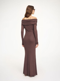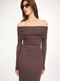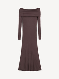 A dress designed for special occasions, the Jytte design is equally elegant and eclectic. The body-hugging dress, which sits off-shoulder, is made in a warm and comfortable wool mix – making it just right for the colder seasons. - Slim fit - Model is 177 cm and is wearing a size S - Off shoulder silhouette - Stretch fabrication - Long sleeves DETAILS COLOUR Coffee Brown COMPOSITION 80% modal, 20% wool CARE Hand wash PRODUCT CODE Style #1034551BM