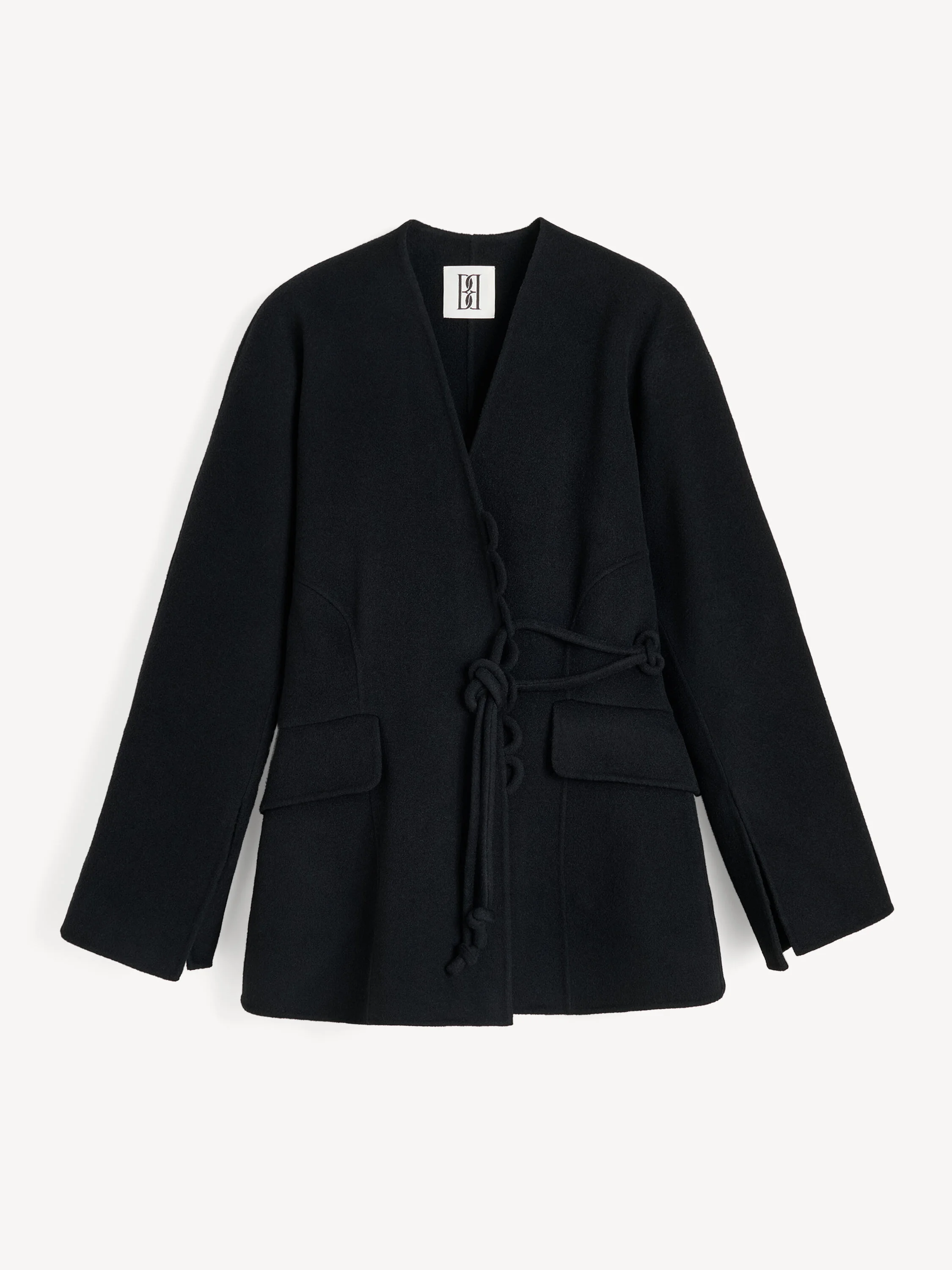 A feminine and warm version of the classic blazer, the Lalou design is crafted in an elegant, felted wool. The wrap silhouette has an adjustable tie closure that allows for creatives ways to wear. Notice the deep slits on both sleeves. For every day, it pairs neatly with the Yalia cotton dress. - Regular fit - Model is 177 cm and is wearing a size 36 - Wrap silhouette - Front pockets - Sleeve slits - Adjustable tie closure DETAILS COLOUR Black COMPOSITION 100% wool CARE Dry clean only PRODUCT CODE Style #102604050