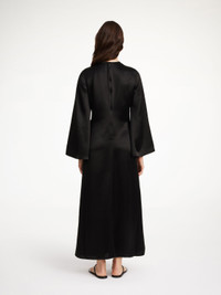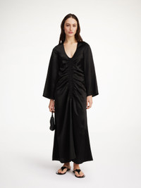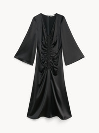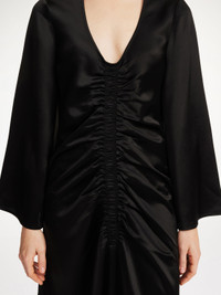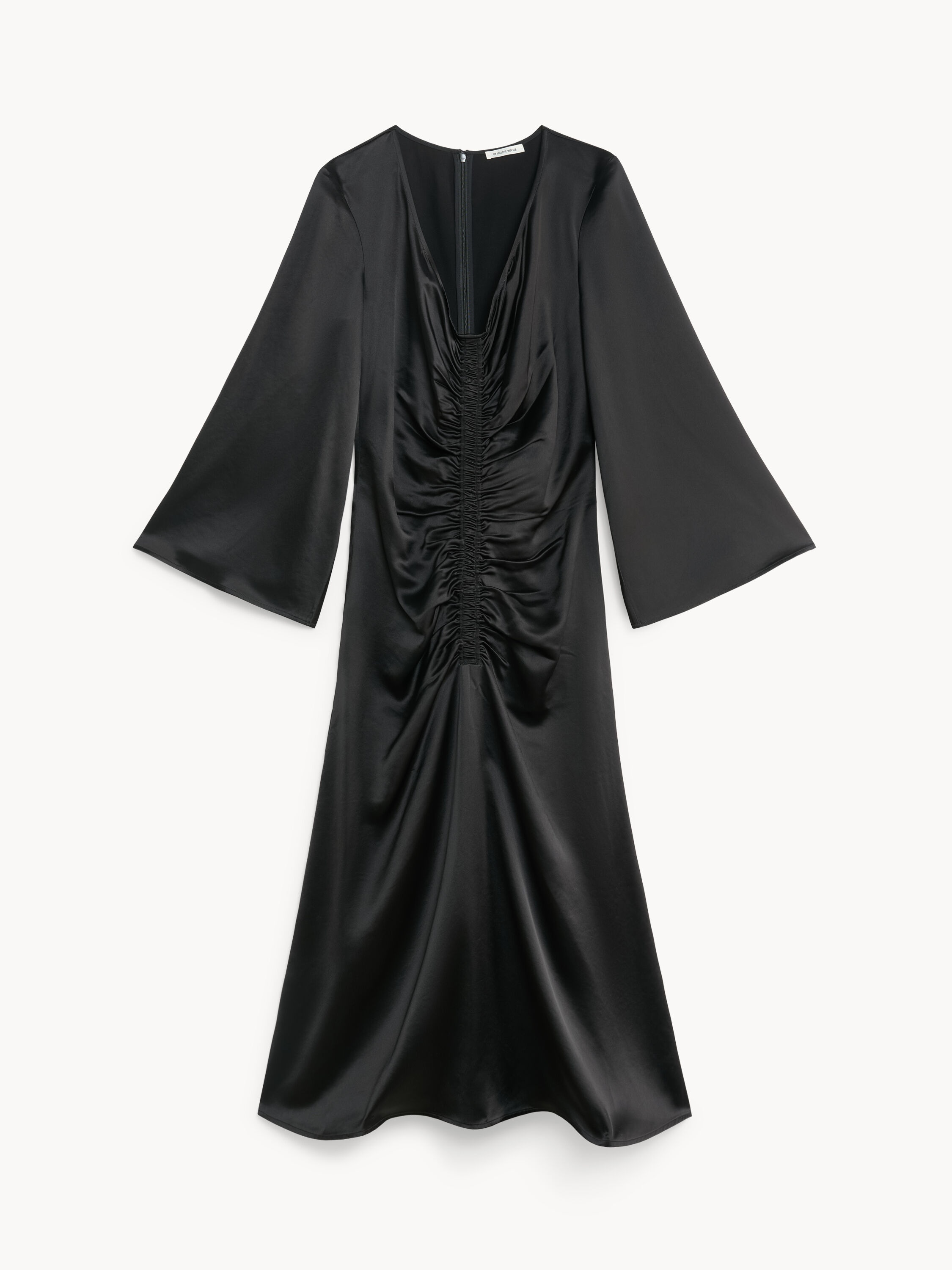 Combining elegance with ease, the Lavende dress allows you to slip into sophistication with minimal effort. The maxi design is ruched for a flattering fit and tempered by a deep neckline and wide sleeves. It closes with a zipper in the back. - Regular fit - Model is 171 cm and is wearing a size 36 - Hook and zip closure in back - V-neck - Wide sleeves DETAILS COLOUR Black COMPOSITION 76% acetate, 24% polyester CARE Delicate machine wash at 30°c PRODUCT CODE Style #102013050