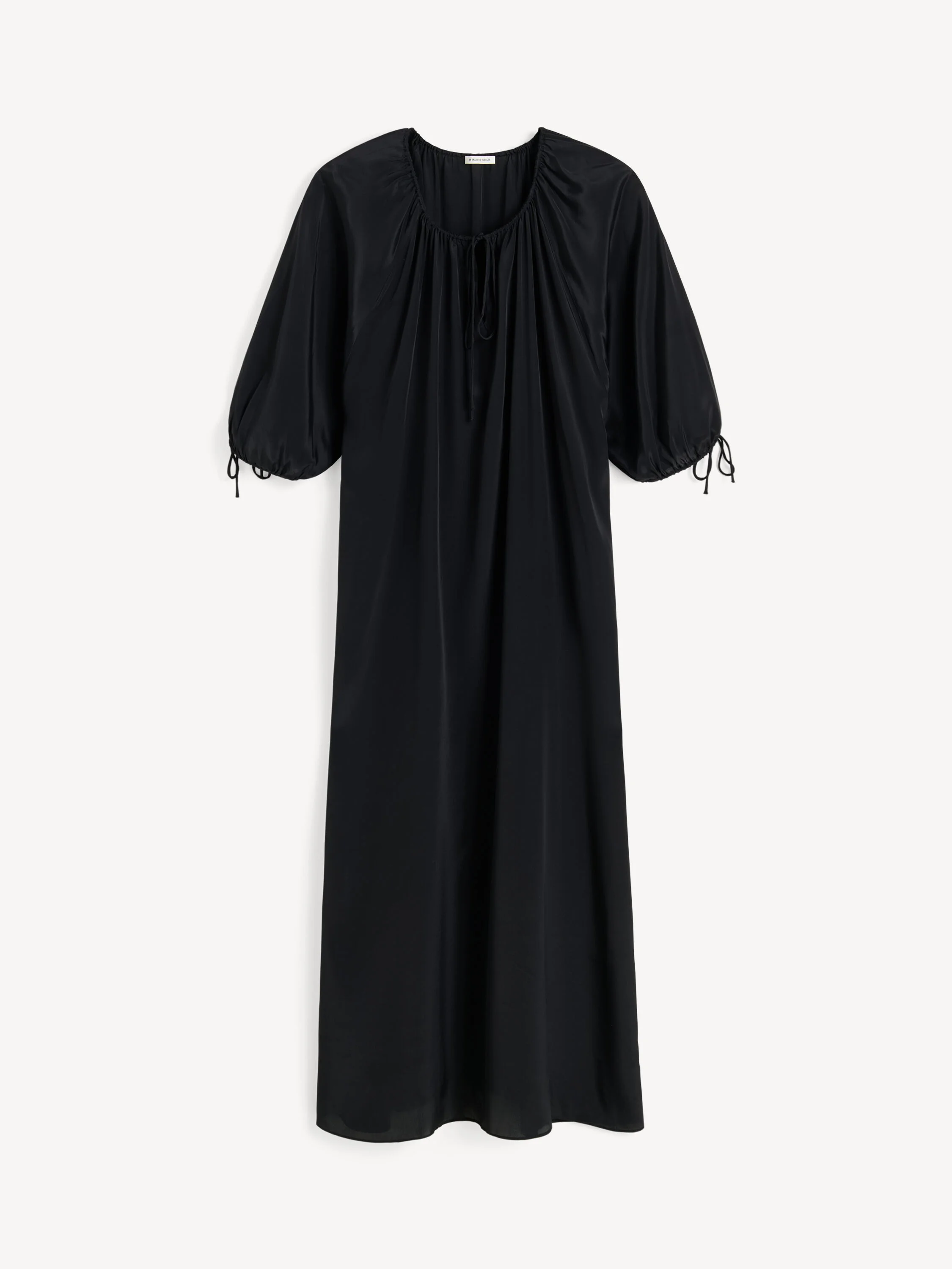 You will be sure to reach for the Lily dress as the temperature rises. The simple voluminous shape and airy silk-blend fabrication make the maxi design equally easy to wear and to style. Adjustable straps allow you to play with its proportions, ensuring just the fit and expression you like. - Oversized fit - Model is 177 cm and is wearing a size 36 - Voluminous silhouette - Adjustable neckline - Adjustable cuffs - Bat sleeves - Unlined DETAILS COLOUR Black COMPOSITION 70% viscose, 30% silk CARE Hand wash PRODUCT CODE Style #103437050