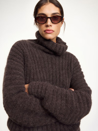 Nothing quite says autumn like a snug voluminous sweater – such as the Mag design. Made in a mohair and alpaca mix with wide ribs, the oversize silhouette is finished with a turtleneck and dolman sleeves. Wear with the Eden Wool skirt on the coldest days. - Loose fit - Model is 178 cm and is wearing a size S - Turtleneck - Dolman sleeves - Rib knit - This product contains 40 % RMS mohair, certified by Control Union, CU 877742. Responsible Mohair Standard (RMS) verifies animal welfare and land management requirements and tracks it from the farm to the final product DETAILS COLOUR Carafe COMPOSITION 40% mohair, 40% alpaca, 20% polyamide CARE Hand wash PRODUCT CODE Style #10342812L