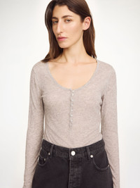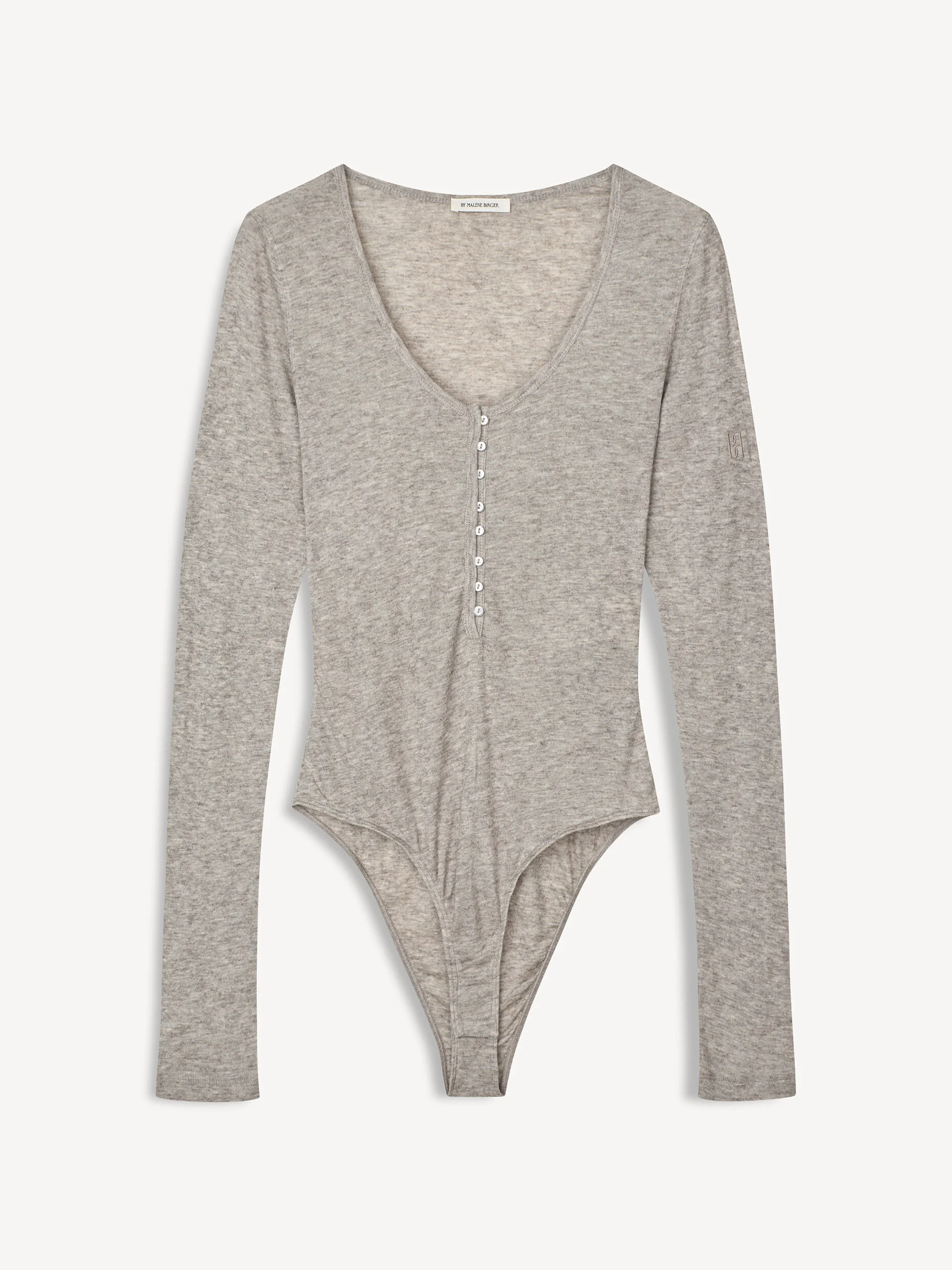 A textbook layering piece all-year around, the Majka bodystocking is made in a semi-sheer wool mix. The simple silhouette is decorated with small front buttons. It closes neatly with click buttons between the legs. - Slim fit - Click button closure - Front buttons - Round neckline - Sheer fabrication DETAILS COLOUR Fosil COMPOSITION 80% modal, 20% wool CARE Hand wash PRODUCT CODE Style #1037531EC