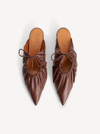 By Malene Birger Masey mules crafted from smooth cow leather for refined comfort. The design is informed by a pointy silhouette and kitten heels, finished with a draped cut-out and slim bow. Wear them with trousers at the office or a dress for a night out. - Pointy toe - Kitten heel - Tie detail - Heel height 3.5 cm DETAILS COLOUR Dark Mahogany COMPOSITION 100% goat leather PRODUCT CODE Style #1021111K2