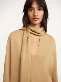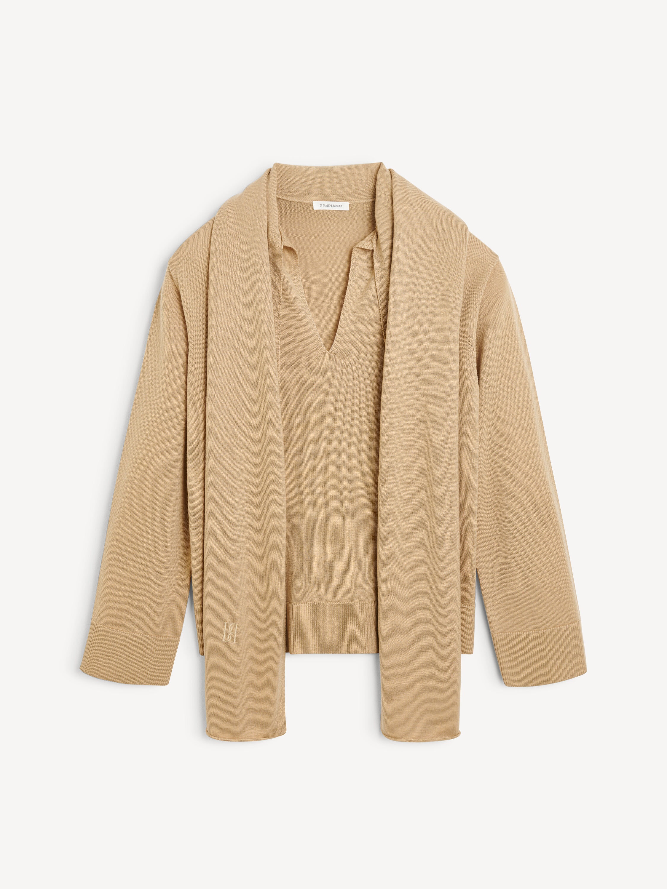 Designed in a classic silhouette that will transcend seasons, the Merrie sweater is made in the softest merino wool. Its best feature is the V-neck with a non-detachable scarf-like collar, which drapes elegantly around the neck. It’s detailed with a small, embroidered monogram. - Loose fit - : Model is 175 cm and is wearing a size S - V-neck - Embroidered monogram - Rib cuffs - Non-detachable scarf collar - This product contains 100% RWS wool, certified by Control Union, CU 877742. The Responsible Wool standard (RWS) verifies animal welfare and land management requirements and tracks it from the farm to the final product DETAILS COLOUR Tannin COMPOSITION 100% wool - merino CARE Hand wash PRODUCT CODE Style #1025411BA