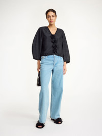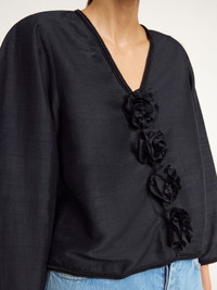 With its delicate Thai silk and billowing silhouette, the Mineas top channels a bohemian vibe. It has a V-neck and wide sleeves tapered towards the cuffs. - Loose fit - Model is 178 cm and is wearing a size 36 - Contrast stitching - V-neck DETAILS COLOUR Black COMPOSITION 100% silk CARE Dry clean only PRODUCT CODE Style #102436050