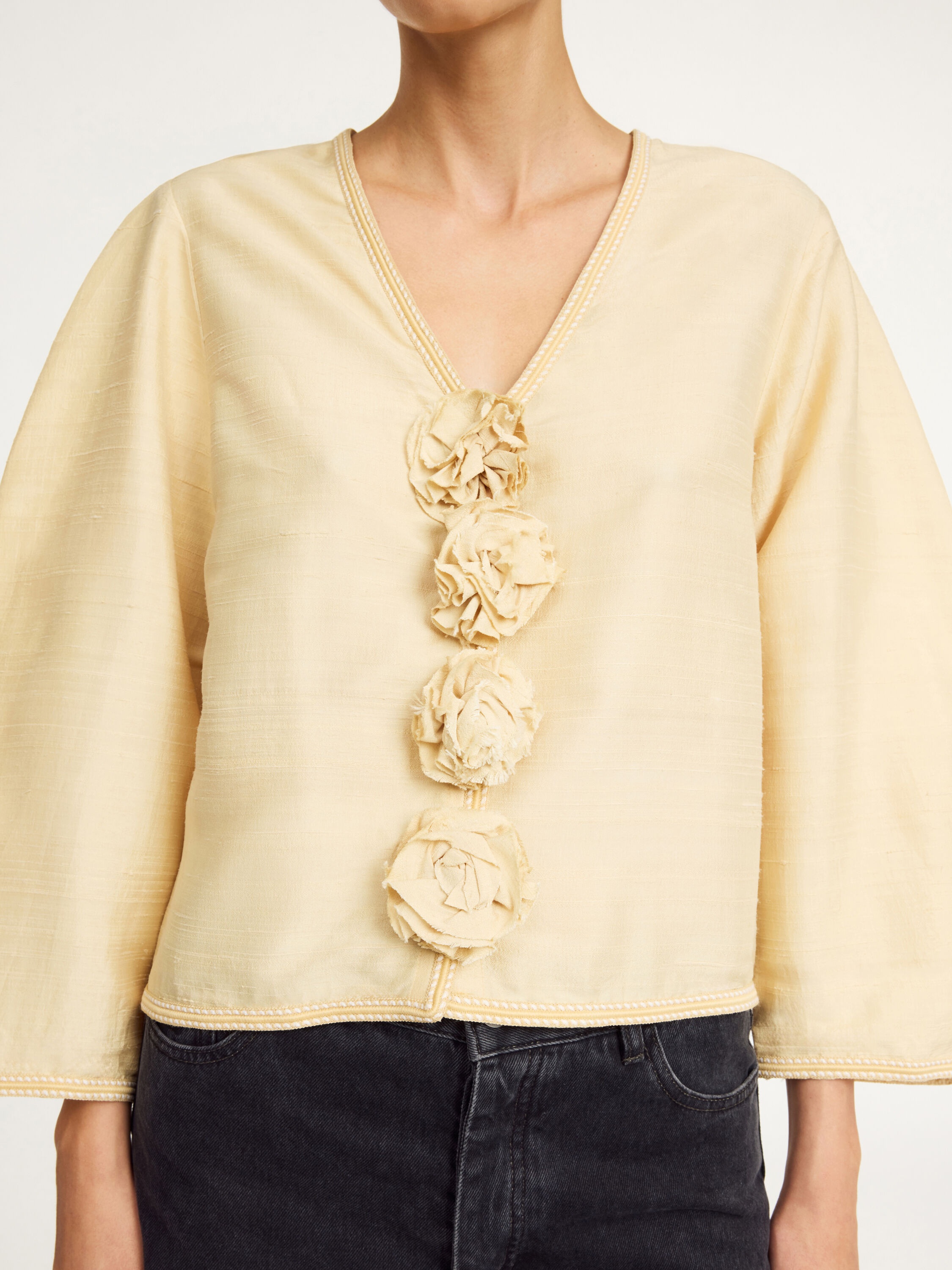 With its delicate Thai silk and billowing silhouette, the Mineas top channels a bohemian vibe. It has a V-neck and wide sleeves tapered towards the cuffs. - Loose fit - Model is 178 cm and is wearing a size 36 - Contrast stitching - V-neck DETAILS COLOUR Sea Mist COMPOSITION 100% silk CARE Dry clean only PRODUCT CODE Style #1024360AJ