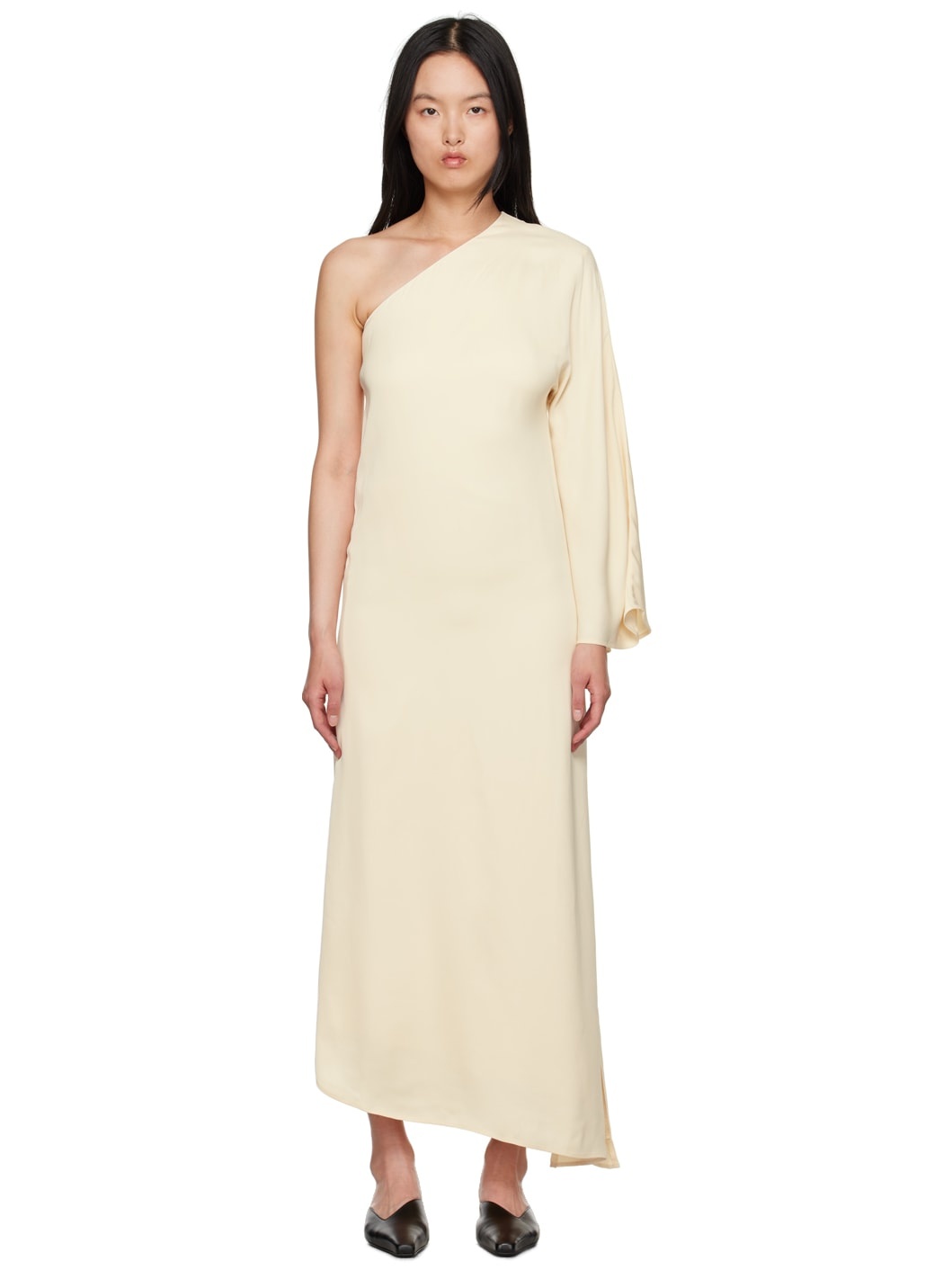 Viscose satin dress. · Single-shoulder construction · Asymmetric neckline and hem · Slit at side seam · Fully lined Supplier color: Vanilla cream