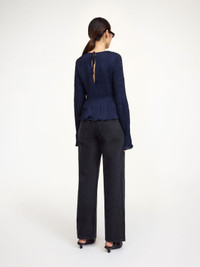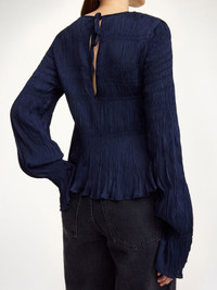 Making an eclectic assertion, the Ovas blouse is designed with smock details galore. The feminine fitted design – which features a low back with a tie closure – is ideal for special occasions. We suggest styling it with the matching Ilona skirt. - Regular fit - Model is 177 cm and is wearing a size 36 - Contains LENZING™ ECOVERO™ viscose fibers - "LENZING™ and ECOVERO™ are trademarks of Lenzing AG - Elastic fabrication - Smock details - Low back - Tie closure - Elongated sleeves - Unlined DETAILS COLOUR Night Sky COMPOSITION 100% viscose CARE Dry clean only PRODUCT CODE Style #1037052Q4
