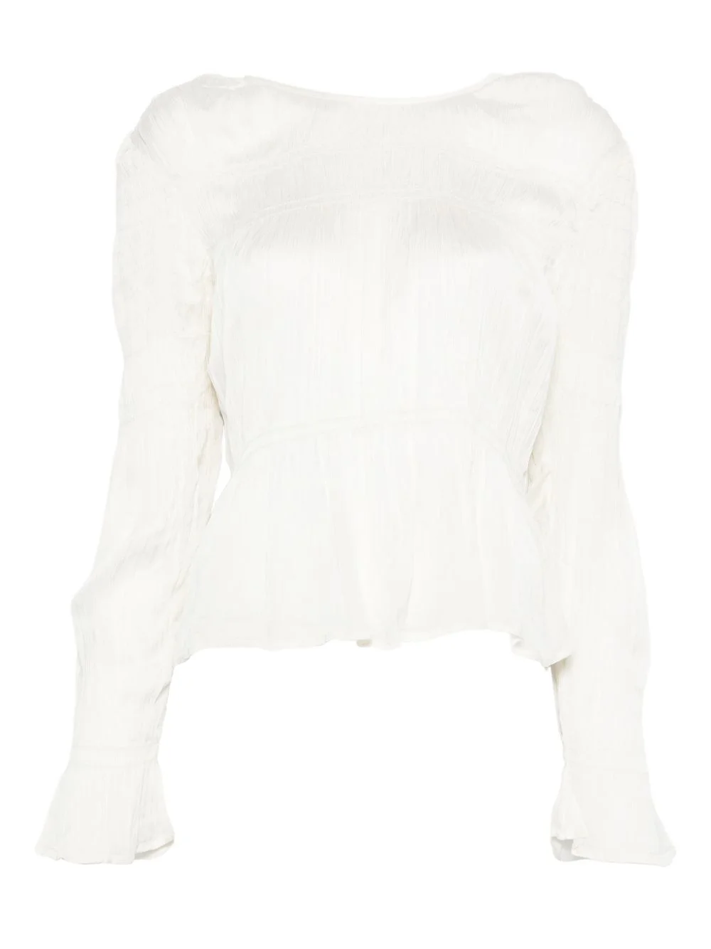Ovas ruffled blouse Highlights - White - Ruffled cuffs - Round neck - Textured - Long sleeves Imported Composition Viscose 100% SIZE & FIT Model measurements Height 5 ft 10 in(1.78 m) Bust/Chest 31.49 in(80 cm) Hips 37 in(94 cm) Waist 23.62 in(60 cm) Washing instructions Dry Clean Only
