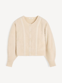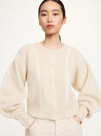 An easy – and ultrawarm – layering piece as the temperatures drop, the Pernille cardigan is made in a soft mohair mix. Detailed with both vertical and horizontal stripes, the button closure design adds a graphic element to your existing edit – and contrasts the plush fabrication. - Regular fit - Model is 177 cm and is wearing a size S - This product contains 72% RMS mohair, certified by Control Union, CU 877742. Responsible Mohair Standard (RMS) verifies animal welfare and land management requirements and tracks it from the farm to the final product - Button closure - Bell sleeves - Collarless DETAILS COLOUR Cream - 093 COMPOSITION 72% mohair, 26% polyamide, 2% elastane CARE Hand wash PRODUCT CODE Style #103442093