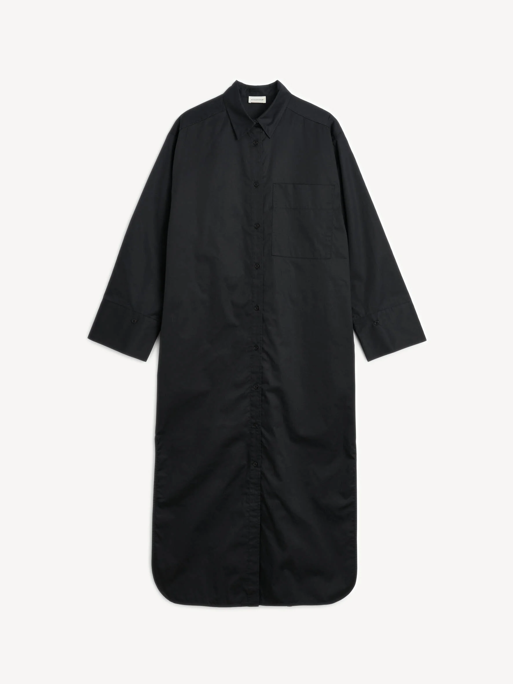 With its versatile design and easy-wearing fabrication, the Perros dress speaks to the modern woman’s wardrobe. Crafted from breezy organic cotton, the maxi-length design is shaped with relaxed shoulders and gathered sleeves that cleverly temper tailored details such as its front pockets and button-down front. Style yours with woven flats and an oversized tote for directional styling. - Oversized fit - Model is 175 cm and is wearing a size 36 - Long sleeved - Front patch pocket DETAILS COLOUR Black COMPOSITION 100% cotton organic CARE Wash at 30°c PRODUCT CODE Style #101930050