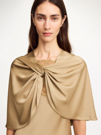 A fittingly chic cover-up for the season’s soirees, the bohemian Pinlos cape is made in lustrous satin. Wear the wrap opening centred or over one shoulder depending on what you wear underneath. - Regular fit - Model is 177 cm - Fringe hem - Satin fabrication - Eastman Naia™ is a cellulosic fibre produced from responsibly sourced wood pulp. It is quick drying, biodegradable, supremely soft and comfortable to wear DETAILS COLOUR Kelp COMPOSITION 85% acetate, 15% polyester CARE Delicate machine wash at 30°c PRODUCT CODE Style #1035831Y7