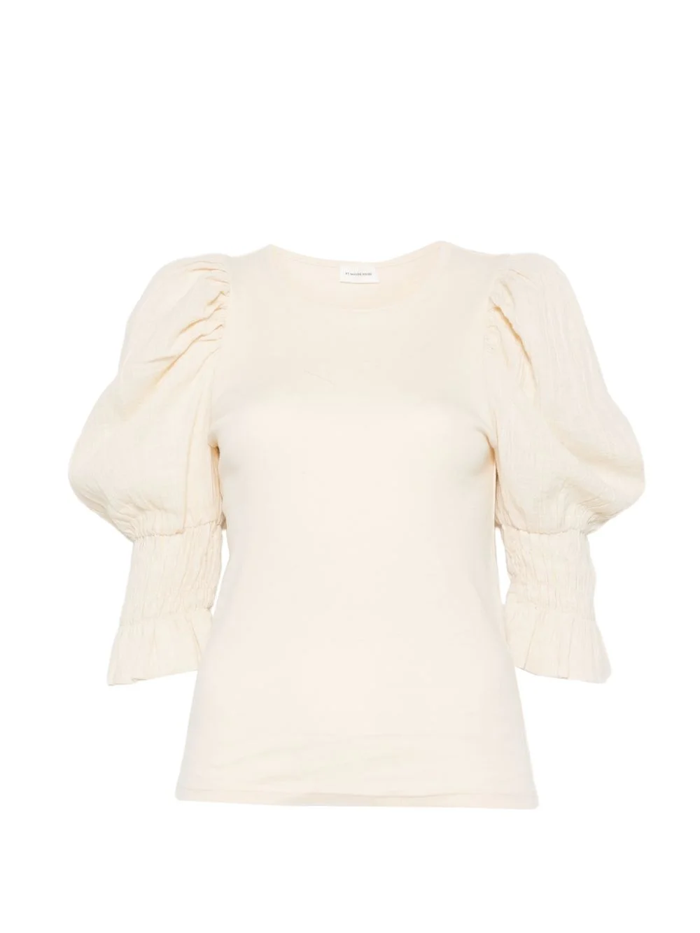 puff-sleeve T-shirt Highlights - Beige - Round neck - Ruffled sleeves - Three-quarter length sleeves - Straight hem Imported Composition Ramie 100%, Cotton 100% Washing instructions Read Manufacturer Guidelines
