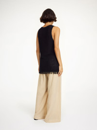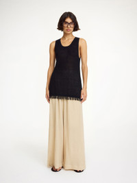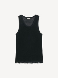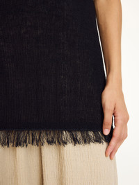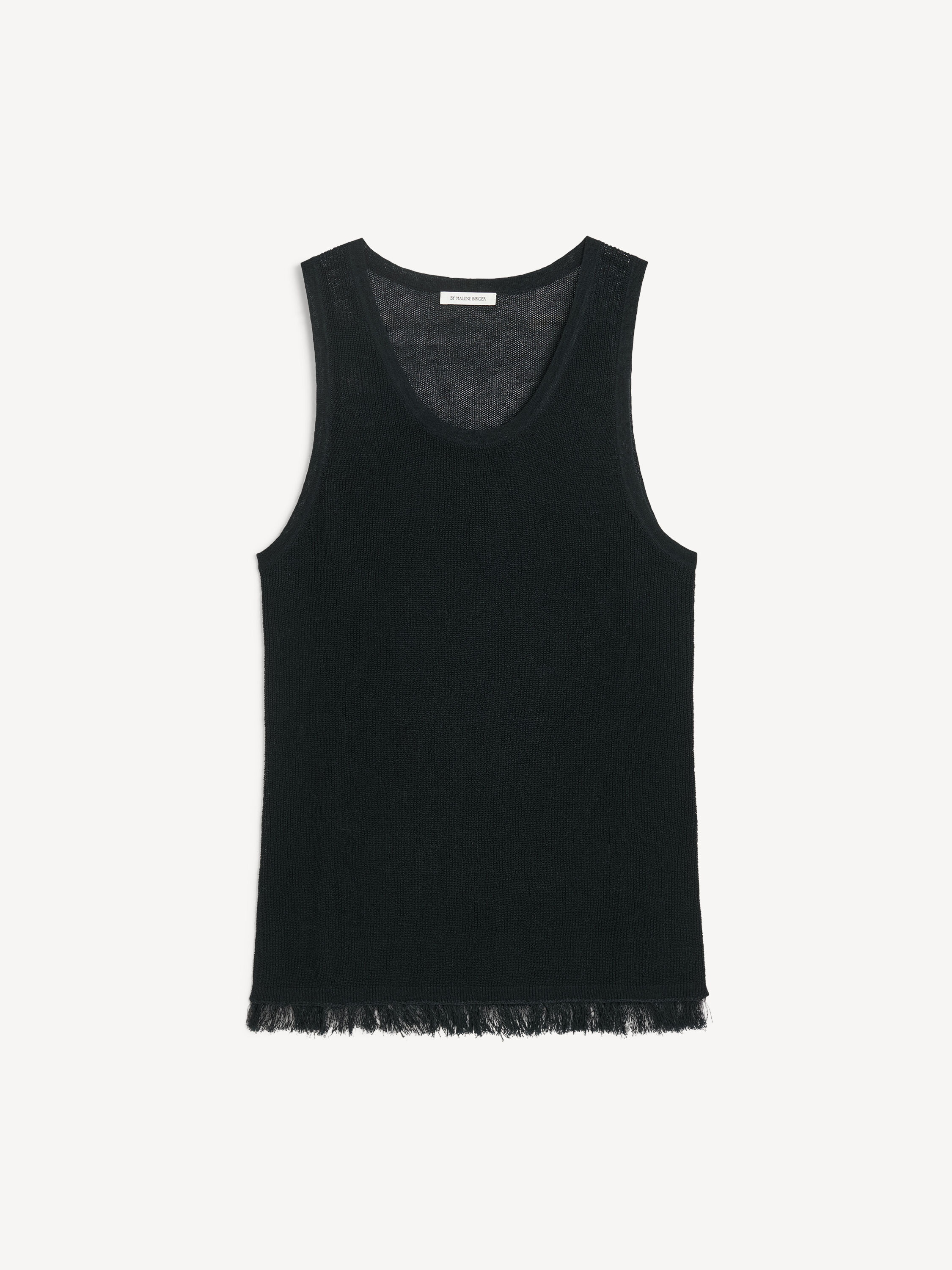 Add a bohemian element to your capsule wardrobe – courtesy of the Rhys top. Inspired by the classic tank top, this light and airy design stands out with its lush fringes. Use as a layering piece or simply with a breezy skirt on warm-weather days. - Model is 175 cm and is wearing a size S - Round neckline - Deep armhole - Fringe details DETAILS COLOUR Black COMPOSITION 61% linen, 15% silk, 12% cotton, 12% polyamide CARE Hand wash PRODUCT CODE Style #103061050