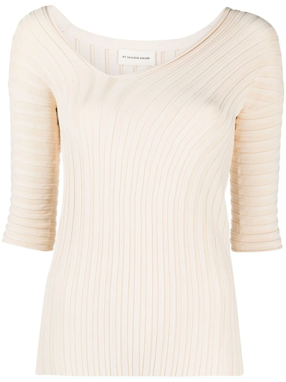 ribbed-knit asymmetric top Highlights - Ecru - Ribbed knit - Asymmetric neck - Half-length sleeves - Straight hem Imported Composition Viscose 87%, Spandex/Elastane 13% Washing instructions Dry Clean Only