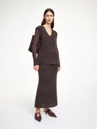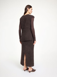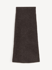 A design made to be worn as the temperatures drop, the Sofia skirt is made in an ultrasoft mohair and alpaca mix. The straight silhouette sits on a high elastic waist and is detailed with rib panels, cut-out details and a back slit. Wear with the coordinating Revna sweater vest. - Regular fit - Model is 177 cm and is wearing a size S - Elastic waist - Rib knit - Straight silhouette - Cut-out details - Back slit - This product contains 40% RMS mohair, certified by Control Union, CU 877742. Responsible Mohair Standard (RMS) verifies animal welfare and land management requirements and tracks it from the farm to the final product DETAILS COLOUR Carafe COMPOSITION 40% mohair, 40% alpaca, 20% polyamide CARE Hand wash PRODUCT CODE Style #10330112L