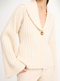 There’s nothing quite like a snug and classical cardigan to use as a layering piece – the Toka design is no exception. Made in a mix of organic cotton and wool, the wide rib silhouette that closes with a single button offers easy wearing. - Regular fit - Model is 177 cm and is wearing a size S - Wide rib fabrication - Single button closure - Wide collar - This product contains 54% RWS wool, certified by Control Union, CU 877742. The Responsible Wool standard (RWS) verifies animal welfare and land management requirements and tracks it from the farm to the final product DETAILS COLOUR Soft White COMPOSITION 54% wool, 44% cotton organic, 2% elastane CARE Hand wash PRODUCT CODE Style #10329703Z