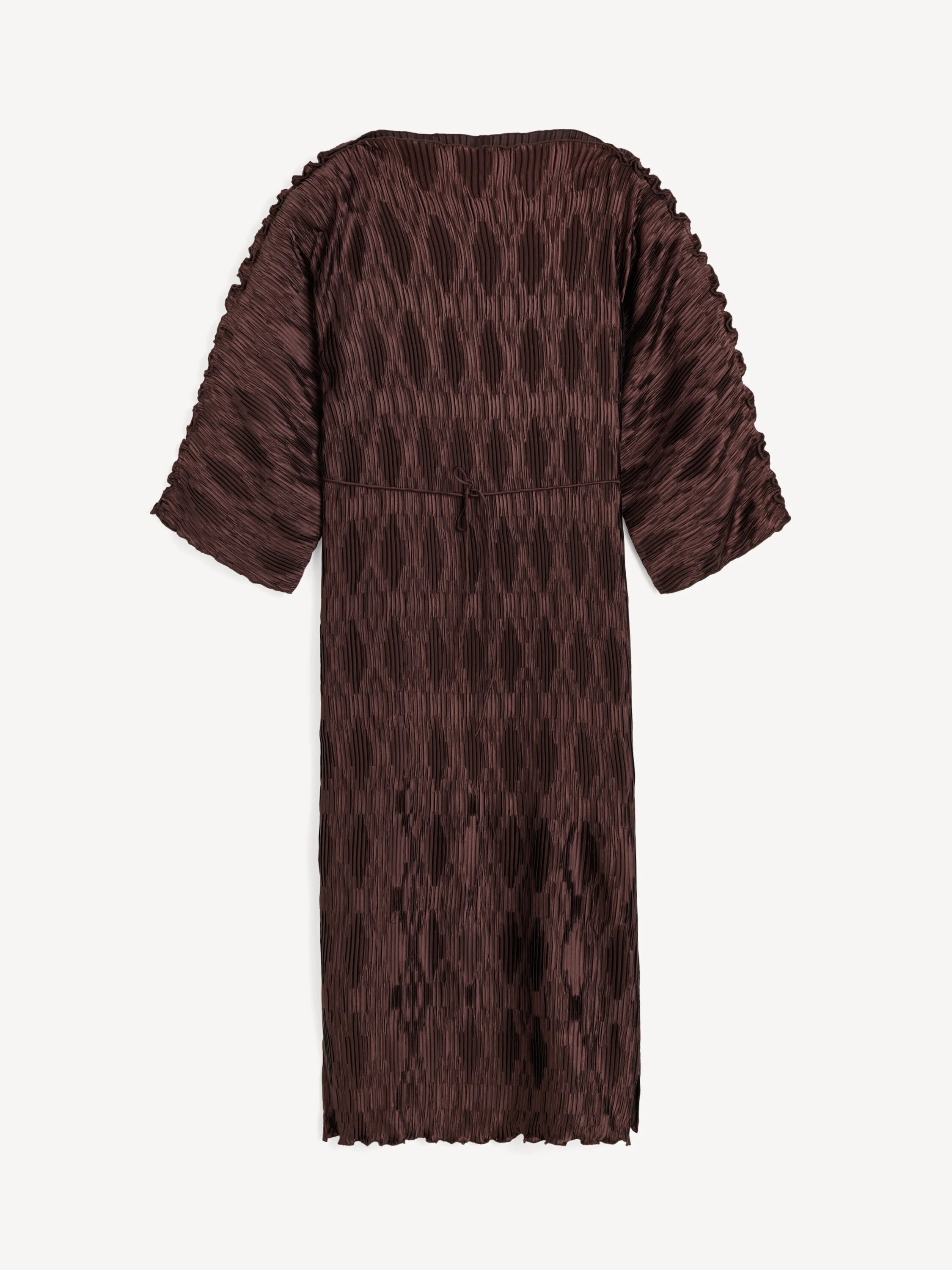 Offering a new kind of tactility, the Tralaido dress is made in a delicate, shimmering plisse that’s ideal as evening takes shape. Made in a loose fit with an adjustable belt, the ankle-gracing silhouette is completed with a flattering boat neckline. - Loose fit - Model is 177 cm and is wearing a size 36 - Ruffled fabrication - Boat neckline - Wide sleeves - Side slits - Ankle length - Loose silhouette - Detachable and adjustable belt DETAILS COLOUR Coffee Brown COMPOSITION 100% polyester recycled CARE Delicate machine wash at 30°c PRODUCT CODE Style #1036031BM
