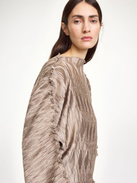Offering a new kind of tactility, the Tralluman top is made in a delicate, shimmering plisse that’s ideal as evening takes shape. Made in a snug fit, the silhouette is completed with a flattering boat neckline. Wear with the coordinating Elisas skirt. - Loose fit - Model is 177 cm and is wearing a size 36 - Ruffled fabrication - Boat neckline - Wide sleeves DETAILS COLOUR Cobblestone COMPOSITION 100% polyester recycled CARE Delicate machine wash at 30°c PRODUCT CODE Style #10360413K