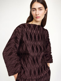 Offering a new kind of tactility, the Tralluman top is made in a delicate, shimmering plisse that’s ideal as evening takes shape. Made in a snug fit, the silhouette is completed with a flattering boat neckline. Wear with the coordinating Elisas skirt. - Loose fit - Model is 177 cm and is wearing a size 36 - Ruffled fabrication - Boat neckline - Wide sleeves DETAILS COLOUR Coffee Brown COMPOSITION 100% polyester recycled CARE Delicate machine wash at 30°c PRODUCT CODE Style #1036041BM