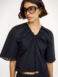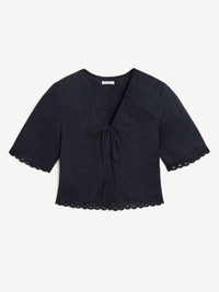 Bohemian femininity and minimalistic easy define the Ulrikke top. It’s shaped with an adjustable V-neck that ties with a cute bow in the front and detailed with embroidered lace at the hem. Pair with jeans, shorts and skirts alike as the temperatures rise. - Regular fit - Model is 175 cm and is wearing a size 36 - Cropped sleeves - V-neck - Adjustable neckline ties - Embroidered lace DETAILS COLOUR Black COMPOSITION 100% cotton organic CARE Delicate machine wash at 30°c PRODUCT CODE Style #103050050