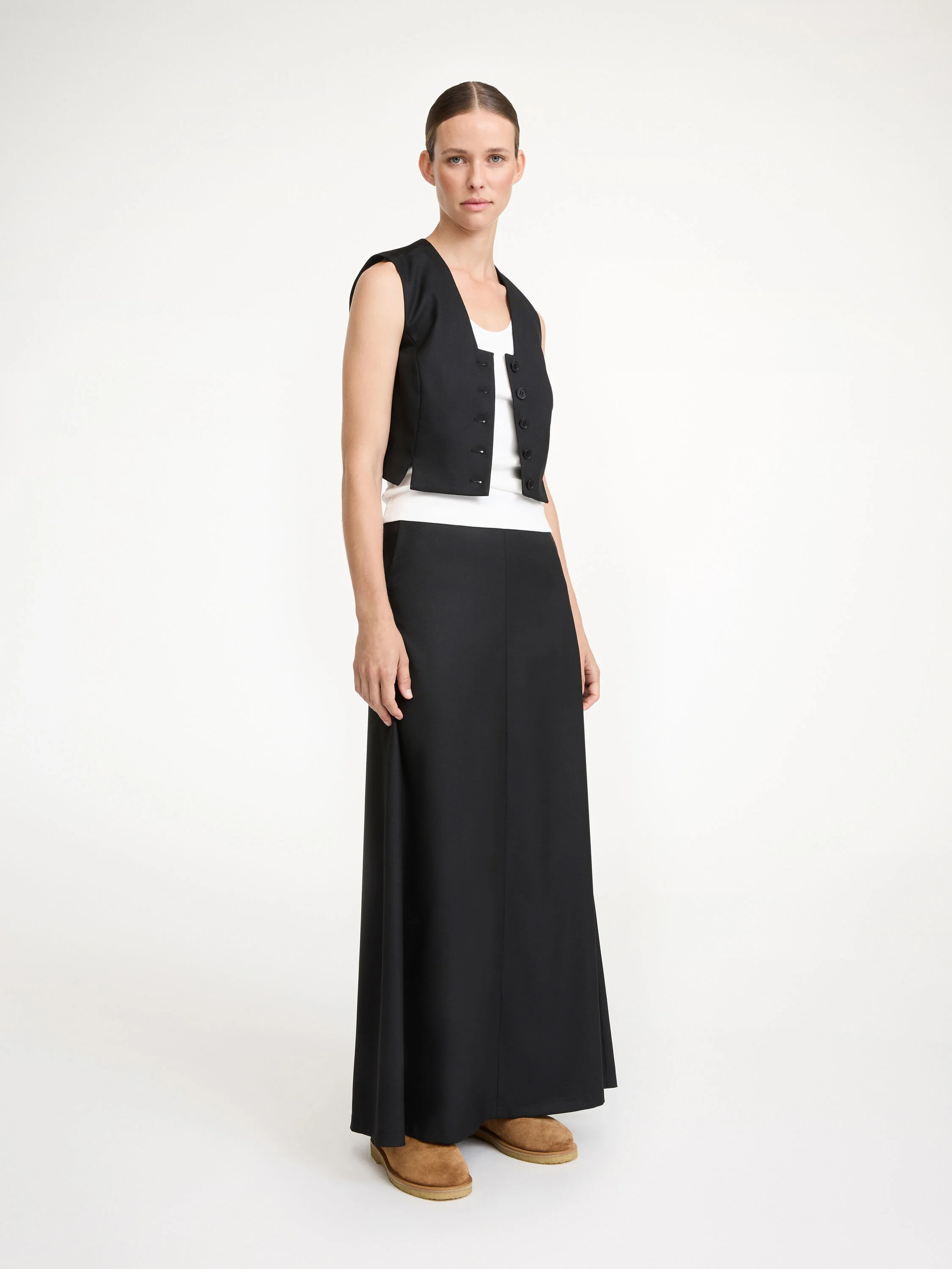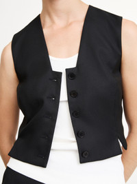 A key piece for the new season, the Bettas waistcoat will lend an androgynous aesthetic to any outfit. The tailored design fastens down the figure with a row of buttons and is shaped with an angular neckline. Pair yours with shorts and a blazer in a similar tone for a directional approach. - Slim fit - Model is 178 cm and is wearing a size 36 - Button-down front - Sleeveless DETAILS COLOUR Black COMPOSITION 69% polyester recycled, 30% viscose, 1% elastane CARE Dry clean only PRODUCT CODE Style #101239050