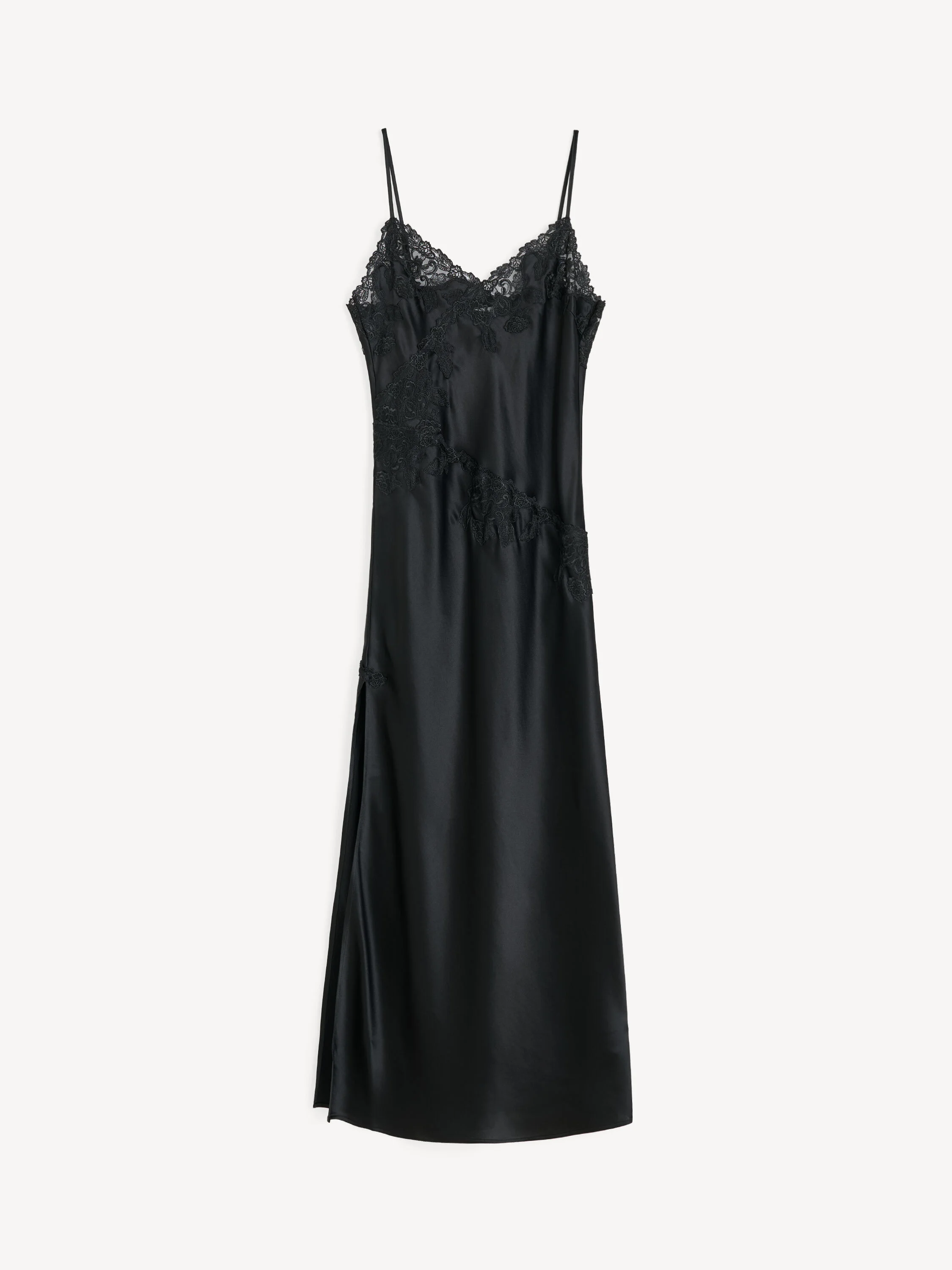 Add a sensual and romantic appeal to your festive wardrobe with the Vera maxi dress – which stands out with its luxe satin and vintage-inspired lace trims. The maxi design is completed with a V-neck, adjustable straps and a high side slit. - Regular fit - Model is 175 cm and is wearing a size 36 - Lace detailing - V-neck - Adjustable straps - Maxi length - Side slit - Eastman Naia™ acetate is a cellulosic fibre produced from responsibly sourced wood pulp. It is quick drying, supremely soft and comfortable to wear. DETAILS COLOUR Black COMPOSITION 76% acetate, 24% polyester CARE Hand wash PRODUCT CODE Style #103770050