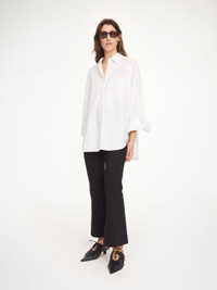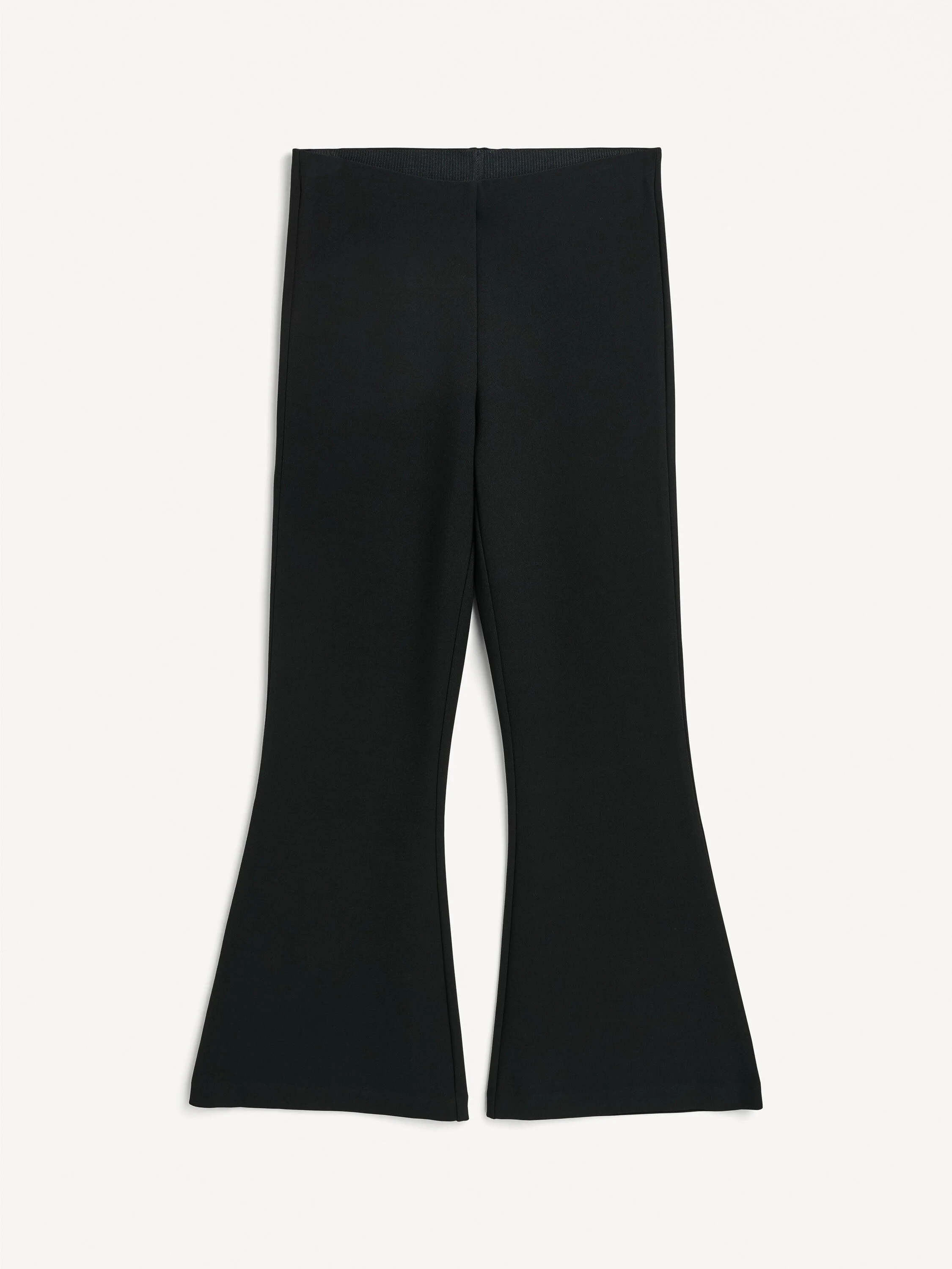 By Malene Birger Vilanna trousers made from a luxurious blend of materials. The design has a comfortable mid waist, flared silhouette, and cropped legs. Wear it throughout the week with an oversized blazer and knitwear. - Regular fit - Model is 176 cm and is wearing a size S - Mid waist - Cropped legs DETAILS COLOUR Black COMPOSITION 56% polyester recycled, 39% polyester, 5% elastane CARE Delicate machine wash at 30°c PRODUCT CODE Style #101800050
