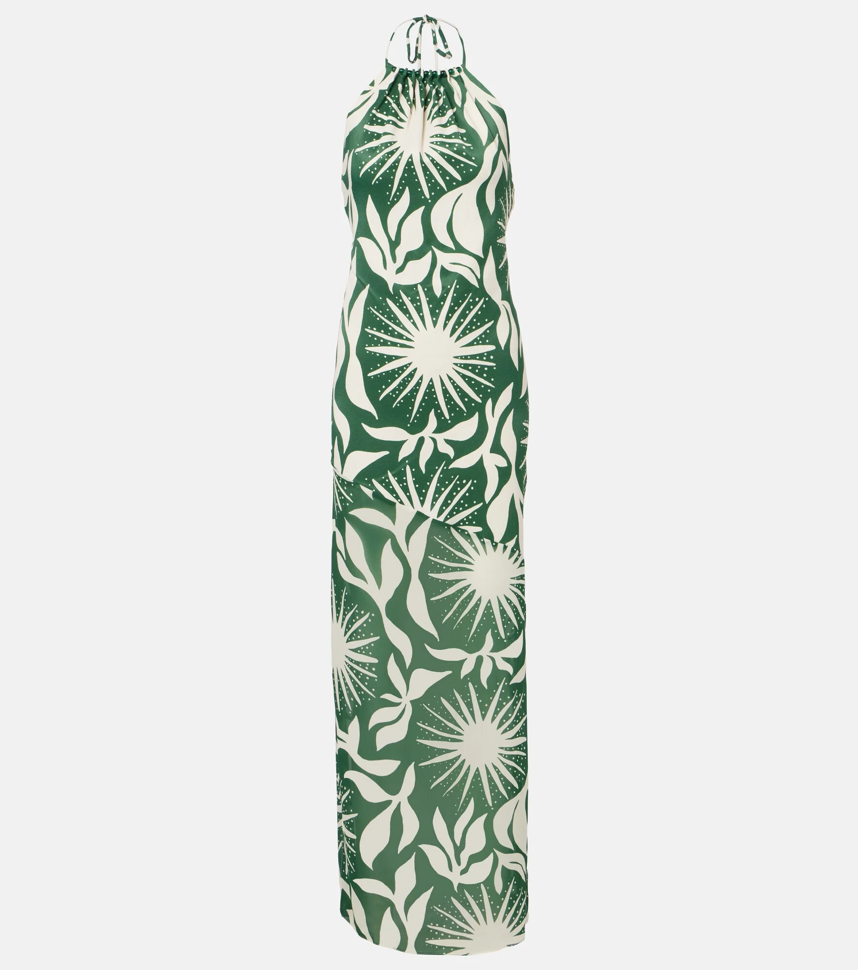 At Cala de la Cruz, vintage-inspired silhouettes and modern sophistication intersect to create striking designs. The Acasia maxi dress is made from a printed fabric, and its self-tie halterneck is embellished with tonal beads. Product Details - Material: 100% viscose - Care instructions: dry clean - Made in Colombia - Color: green - Designer color name: Soleilsage - Self-tie neck - Side slits - Closure: concealed zipped back - Item number: P01168169 Size & Fit - True to size - Low back - Cinched waist - Non-stretchy fabric - The model seen in the picture is 178cm-5'10" and wearing a size XS