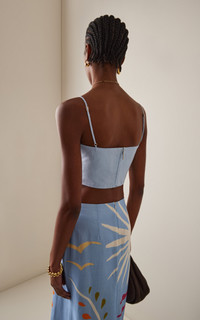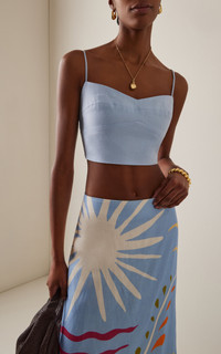 Hailing from Cali, Colombia, Cala de la Cruz is the brainchild of Carolina Lopez, who harnesses her expertise in textiles, bold prints, and mesmerizing color combinations into responsibly fabricated and produced warm-weather treasures that exude a joyful ease. Crafted from breathable linen, the 'Lorenzo' crop top is precisely-tailored to the form with a subtle bustier neckline. PRODUCT DETAILS - Spring/Summer '25 - Zip fastening along back - Composition: 100% Linen - Designer color: Celeste - Dry clean - Made in Colombia SIZE & FIT - Designed for a slim fit