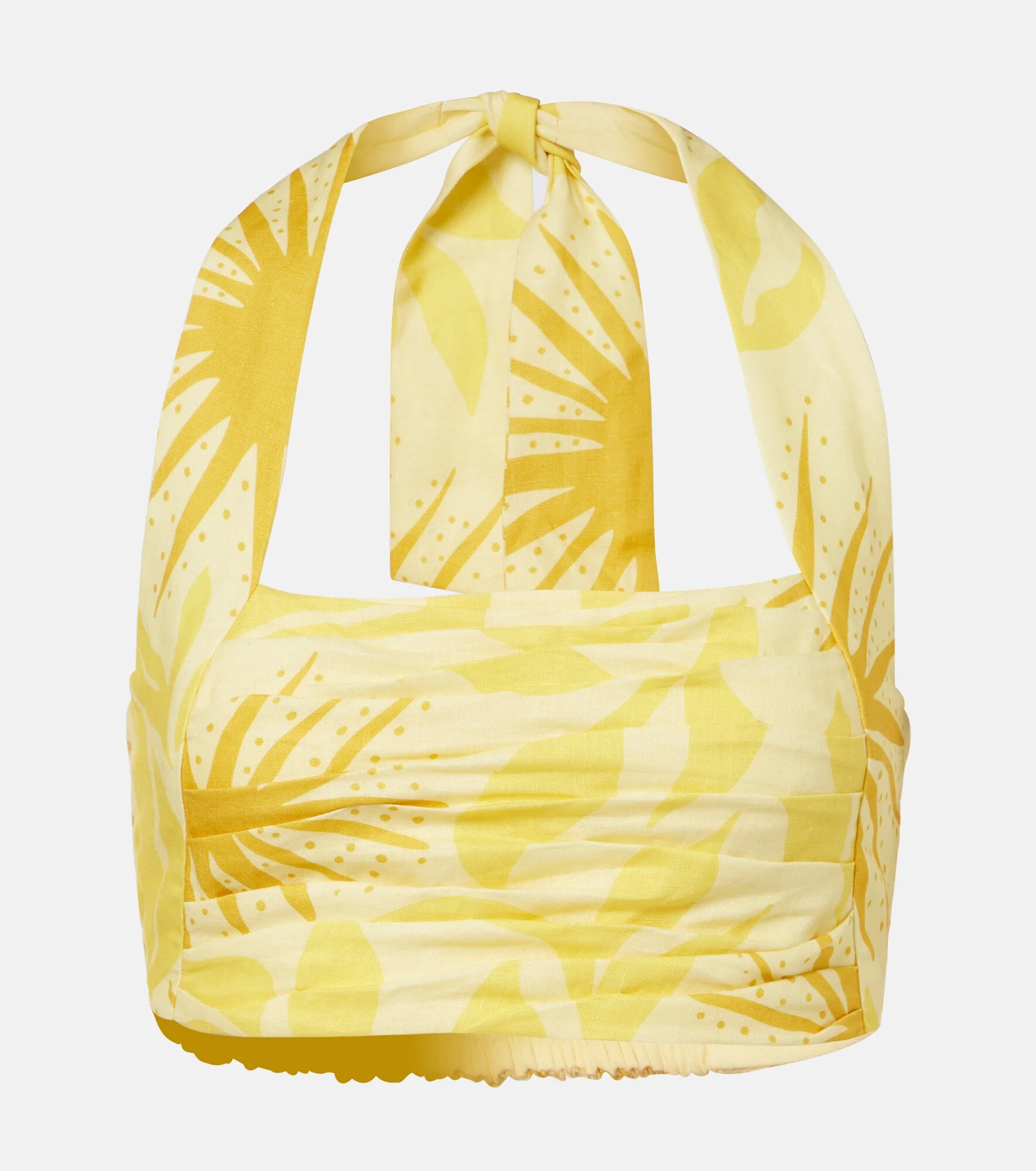 At Cala de la Cruz, vintage-inspired silhouettes and modern sophistication intersect to create striking designs. The Fuji crop top is made from printed linen and features a self-tie halterneck silhouette with a shirred back bodice. Product Details - Material: 100% linen - Care instructions: dry clean - Made in Colombia - Color: yellow - Designer color name: Soleilama - Closure: self-ties - Item number: P01168177 Size & Fit - True to size - Low back - Elasticated top - Fitted - Non-stretchy fabric - Cropped - The model seen in the picture is 178cm-5'10" and wearing a size XS