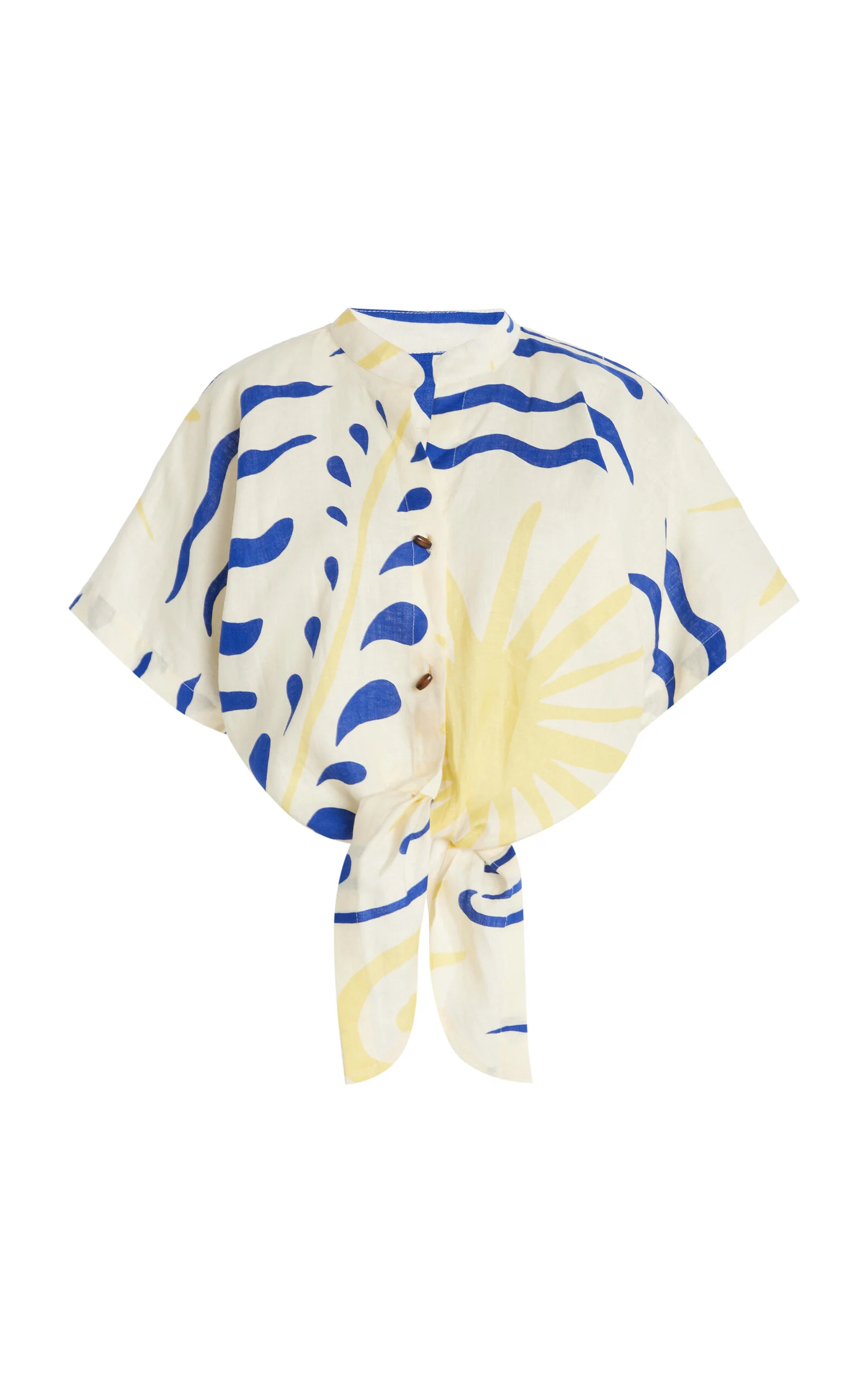 Hailing from Cali, Colombia, Cala de la Cruz is the brainchild of Carolina Lopez, who harnesses her expertise in textiles, bold prints, and mesmerizing color combinations into responsibly fabricated and produced warm-weather treasures that exude a joyful ease. Cut and tailored from breathable linen, the 'Leroy' is a short sleeve button-down with a front tie, reinterpreted each season with a new print. PRODUCT DETAILS - Spring/Summer '25 - Button fastening through front - Composition: 100% Linen - Designer color: Malibu Azul - Dry clean - Made in Colombia SIZE & FIT - Our model is wearing a size Small - Model is 5'10" with a 31" bust, 23.5" waist, and 33.5" hip - Designed for a relaxed fit
