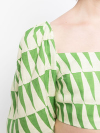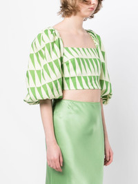 Sami geometric-print linen top Highlights - Grass green/light beige - Linen/flax - Geometric-pattern print - Shirred panel - Cropped - Rear tie fastening - Rear zip fastening - Three-quarter length puff sleeves Imported Composition Linen/Flax 100% SIZE & FIT Model measurements Height 5 ft 9 in(1.76 m) Bust/Chest 29.92 in(76 cm) Hips 35.82 in(91 cm) Waist 25.98 in(66 cm) FittingInformation Designed for a close fit throughout Cropped in length Made from a lightweight non-stretch fabric This piece fits true to size – take your usual size Washing instructions Dry Clean Only
