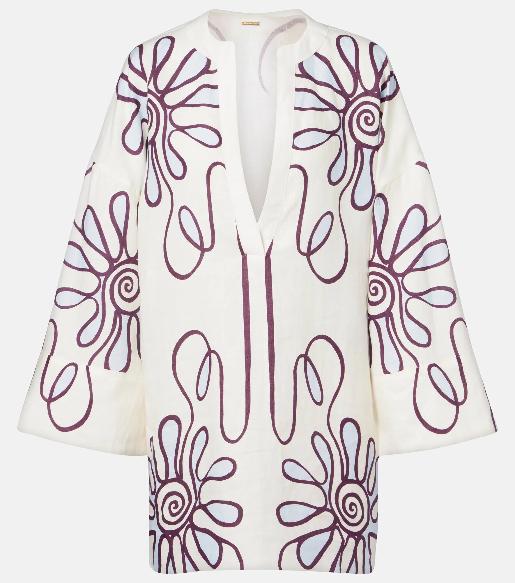 At Cala de la Cruz, vintage-inspired silhouettes and modern sophistication intersect to create striking designs. The Siena tunic is made from breathable, breezy linen with an eye-catching print. Product Details - Material: 100% linen - Care instructions: dry clean - Made in Colombia - Color: white - Designer color name: Namurceleste - Item color: white, purple - Item number: P01122121