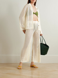 Calle Del Mar's pants have been crocheted in California, where most of the brand's inspiration is drawn from. This laid-back style is cut with wide legs and features geometric motifs across the hems. Lower-Impact Materials. This product is made using at least 50% lower-impact materials or ingredients. Responsible Craftsmanship. This product promotes artisanal skills and a brand that invests in communities and adheres to fair-trade principles. Find out more about our NET SUSTAIN criteria here. Size & Fit - Fits true to size, take your normal size - High-rise, designed for a wide-leg fit - Drawstring waist, designed for a flexible fit - Mid-weight, open knit - S/M/L sizing Details & Care - Beige viscose - Pull on - 100% viscose - Green dry clean - Designer color: Natural