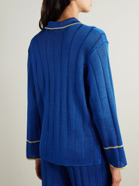 Calle Del Mar's shirt is meant to be worn with the matching pants in our edit - the set is inspired by vintage pajamas. It's made from royal-blue ribbed-knit and has contrasting yellow trims tracing the neat collar and buttoned placket. Lower-Impact Materials. This product is made using at least 50% lower-impact materials or ingredients. Responsible Craftsmanship. This product promotes artisanal skill and brands that invest in communities and adhere to fair-trade principles. Find out more about our NET SUSTAIN criteria here.