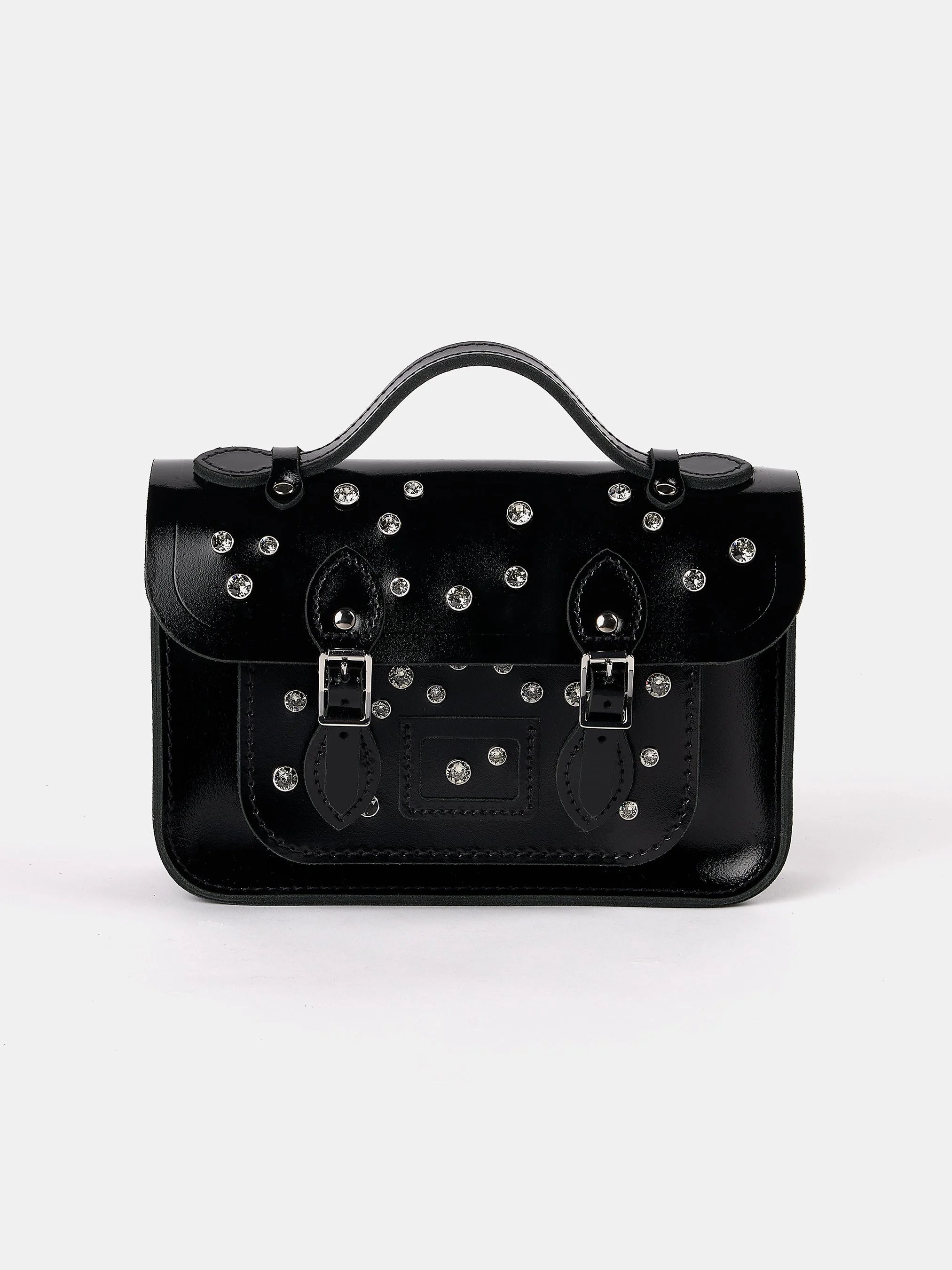 A timeless classic meets festive sparkle in The Mini Satchel from our Festive Collection in high-shine black. Handcrafted in England from premium leather, this limited-edition bag is adorned with Swarovski® Crystals in Black Diamond, scattered to catch the light with subtle, sophisticated shimmer, perfect for winter celebrations, evening outings, or elevating your everyday wardrobe. Designed for versatility, it features a top handle for hand carry and a slim, detachable, adjustable shoulder strap for crossbody wear. Its compact size houses a characteristic front pocket, ideal for small essentials, while magnetic closures keep your belongings secure. Polished nickel hardware and a carefully embossed logo on the reverse complete the refined finish. Key Features: - Handcrafted in England - Embellished with precision-cut brilliant Swarovski® XIRIUS Chaton Crystals - Slim, detachable, adjustable shoulder strap - Solid construction with magnetic closures SIZE & FIT - Sunglasses - Lipstick - Phone - Purse/Wallet - Keys - Chewing Gum External (Including Handle): - H: 7.48 inches - W: 8.46 inches - D: 2.36 inches External (Excluding Handle): - H: 5.91 inches - W: 8.46 inches - D: 2.36 inches Internal: - H: 5.12 inches - W: 7.28 inches - D: 0.98 inches Pocket Internal: - H: 3.15 inches - W: 4.92 inches - D: 0.39 inches Strap Drop: Short: 20.87 inches Long: 30.31 inches *All measurements are approximate and can vary slightly as each bag is handmade from a natural material.* External (Including Handle) H: 19cm W: 21.5cm D: 6cm External (Excluding Handle) H: 15cm W: 21.5cm D: 6cm Internal H: 13cm W: 18.5cm D: 2.5cm Pocket Internal H: 8cm W: 12.5cm D: 1cm Strap Drop Short: 53cm Long: 77cm