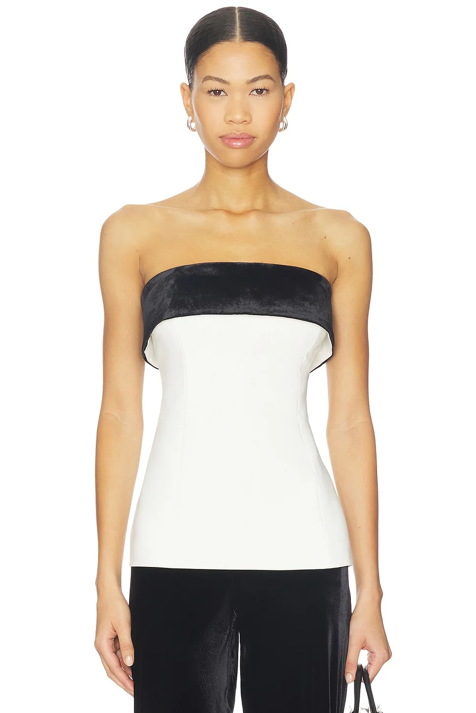- 67% polyester 28% rayon 5% spandex Contrast fabric: 82% viscose 18% silk Lining: 100% viscose - Made in China - Machine wash - Back zip with hook and eye closure - Velvet foldover detail - Revolve Style No. CAMN-WS627 - Manufacturer Style No. H25-T02
