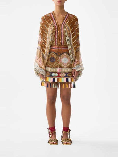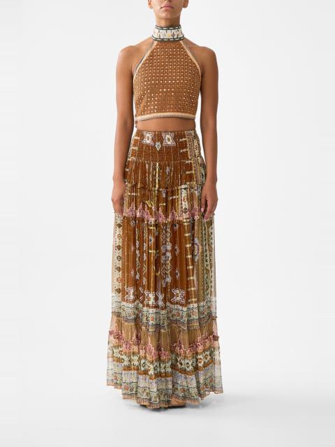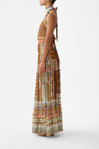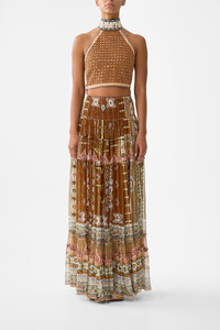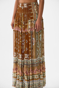 The Fabric Of Time 4 Tiered Gathered Skirt is a handcrafted silhouette designed by our in house artisans. Reimagined in an exclusive limited edition print, this beautifully textured skirt has been intricately crafted with lurex for luminous sparkle. It features a shirred waistband that melts into tiered frills, falling to a sweeping floor length hemline. Its complete with lining and finished with intricately placed crystal embellishments for luminous detail. - Maxi Length - Shirred Waistband - Tiered Frills - Lined Skirt - Silk Lurex Fabric - Crystal Embellishment SKU 00038645-FABRTIME-XS Size and Fit Our model is 5'10 (178cm) tall and wears a size S (AU 10). Bust: 40in (101.6cm) Waist: 26.5in (67cm) Hips: 38in (96.5cm) Designed as a relaxed fit. Take your normal size, or select one size smaller for a neater fit. Fabric and Care 95%VISCOSE/5% LUREX