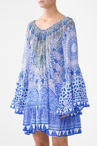 The The Bosphorous A-Line Frill Dress is a handcrafted silk silhouette designed by our in house artisans. Reimagined in an exclusive limited edition print, this dress is cut in a relaxed, loose fit that cascades into flowy, frilled sleeves and hemline. It's elasticated neckline offers versatility while crystal embellishment add luminous detail. - 100% Silk - Crystal Embellishment - Elasticated Neckline - Loose Fit - Frill Sleeve And Hem SKU 00041690-BOSPHORS-XXS Size and Fit Our model is 5'10 (178cm) tall and wears a size S (AU 10). Bust: 40in (101.6cm) Waist: 26.5in (67cm) Hips: 38in (96.5cm) Designed as a relaxed fit. Take your normal size, or select one size smaller for a neater fit. Fabric and Care 100% SILK With its subtly textured surface, silk crepe is our core fabrication made perfect for versatile wear. With its ability to hold alternative ways to wear, this decadent fabric drapes elegantly off the body whilst keeping you cool with its breathable nature.