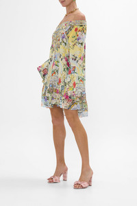 Designed in Australia, The Flor Fantastica A Line Frill Dress echoes the splendour of Queluz Palace, soft yellow hues bloom amidst florals inspired by its lush gardens. A celebration of nature's elegance and timeless artistry. Lovingly handcrafted, this CAMILLA silk mini dress can be worn as an off-the-shoulder dress or a timeless scoop neck. The voluminous swing-shaped body and elegant flared sleeves are finished with deep ruffle hems to ensure this silk mini dress creates a romantic billow with every step. - Crystal Embellishment - Elasticated Neckline - Loose Fit - Frill Sleeve And Hem - Mini Length - Non-Sheer SKU 00033237-FLORFANT-XXS Size and Fit Our model wears a CAMILLA S and is 5'10 (178cm) tall. Her standard dress size is an AU 10. She has a 32in (83cm) bust, 35in (89.5cm) hips and a 25in (66cm) waist. CAMILLA Size S = AU10 / UK10 / US6 Our More to Love Model wears a CAMILLA Size 3XL and is 5'9 (182cm) tall. Her standard dress size is a AU 20. She has a 42in (107cm) bust, 35.8in (91cm) waist and 46in (118cm) hips. CAMILLA Size 3XL = AU20 / UK20 / US16 Designed as a relaxed fit, take your normal size or select one size smaller for a neater fit Fabric and Care 100% SILK With its subtly textured surface, silk crepe is our core fabrication made perfect for versatile wear. With its ability to hold alternative ways to wear, this decadent fabric drapes elegantly off the body whilst keeping you cool with its breathable nature.