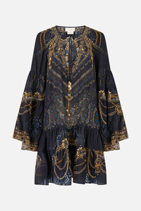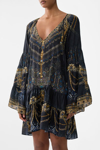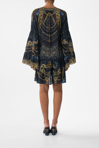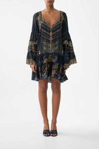 The Song Of The Solstice A-Line Gathered Panel Dress is a handcrafted silk silhouette designed by our in house artisans. Reimagined in an exclusive limited edition print, our A line panel dress is cut in relaxed fit and features a v neckline and flared sleeves. It's finished with intricately applied crystal embellishments. - 100% Silk - Crystal Embellishment - V Neckline - Relaxed Fit - Flared Sleeve SKU 00036723-SONGSOLS-XXS Size and Fit Our model is 5'10 (178cm) tall and wears a size S (AU 10). Bust: 40in (101.6cm) Waist: 26.5in (67cm) Hips: 38in (96.5cm) Fabric and Care 100% SILK With its subtly textured surface, silk crepe is our core fabrication made perfect for versatile wear. With its ability to hold alternative ways to wear, this decadent fabric drapes elegantly off the body whilst keeping you cool with its breathable nature.
